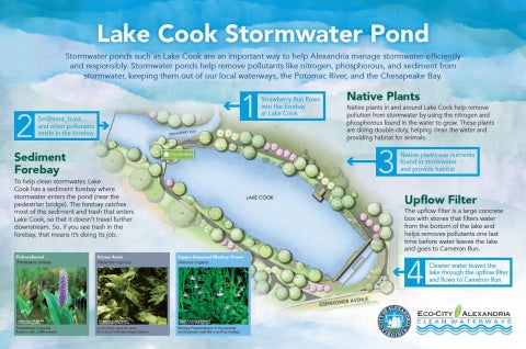 Solution: Following a pond feasibility study in 2012, the City of Alexandria prioritized water quality improvements and additional public amenities at Lake Cook. A sediment forebay and upflow filter were installed to remove pollutants and more than 2,500 native plants were also planted at the site. There is now an expanded fishing pier, permeable lakeside path, a pedestrian bridge and public art by a local artist is featured at the site.