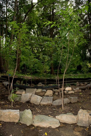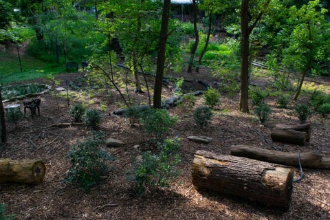 Problem: Stormwater runoff from Woodend, a 40-acre nature sanctuary in Chevy Chase, MD that serves as headquarters of the Audubon Naturalist Society, was impacting neighboring property and adding to pollution in nearby Rock Creek. Design challenges included the site’s historic registration, steep slope and existing mature trees.